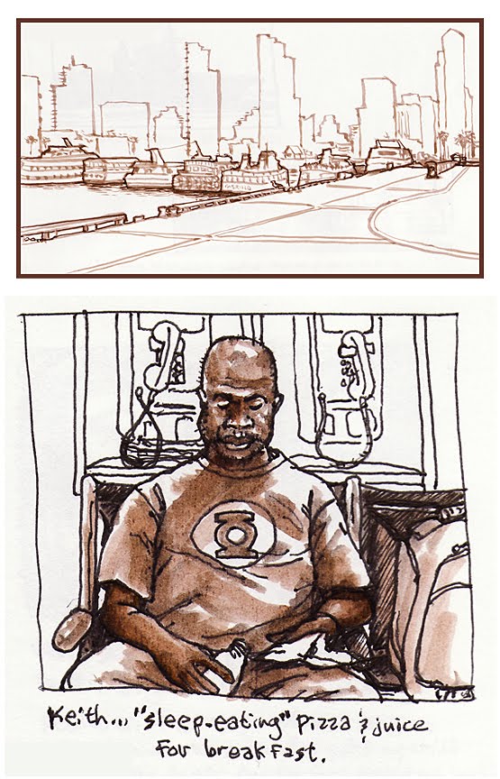 Since I've been too busy this week to do much sketching, I decided to look back through some of my older drawings. These are sketches I did while on a business trip to San Diego back in 2006. My favorite is at the bottom of this post...my good friend Keith was waiting in the airport for an early flight back to Kansas City, "sleep-eating" a slab of pizza for breakfast.